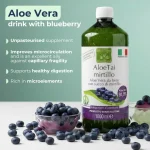 AloeTai blueberry is a supplement made from pure Aloe Vera juice with added blueberry juice. Aloe gel is manually extracted from the heart of the fresh leaf and cold homogenized, without undergoing any pasteurization process. The product combines all the properties of Aloe Vera with those of blueberry juice.