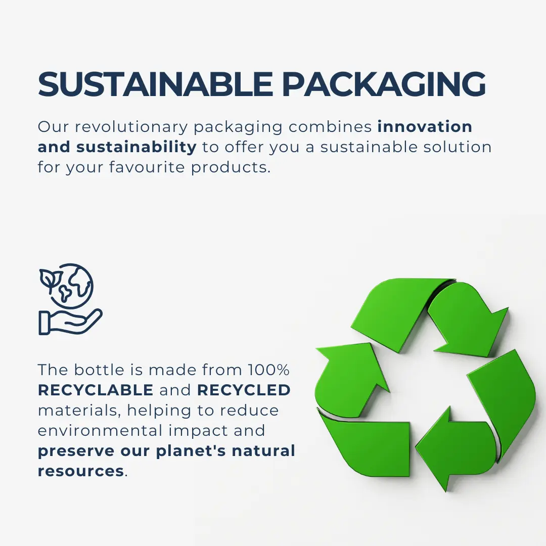 Our revolutionary packaging combines innovation and sustainability to offer you a sustainable solution for your favorite products. The bottle is made from 100% RECYCLABLE and RECYCLED materials, helping to reduce environmental impact and preserve our planet’s natural resources.