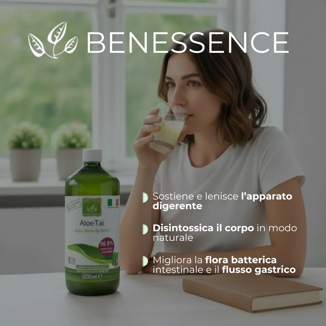 AloeTai è una bevanda naturale a base di puro succo e polpa di Aloe Vera da bere senza acqua aggiunta. Il gel di Aloe è estratto manualmente dal cuore della foglia fresca ed omogeneizzato a freddo, senza subire alcun processo di pastorizzazione o filtrazione.