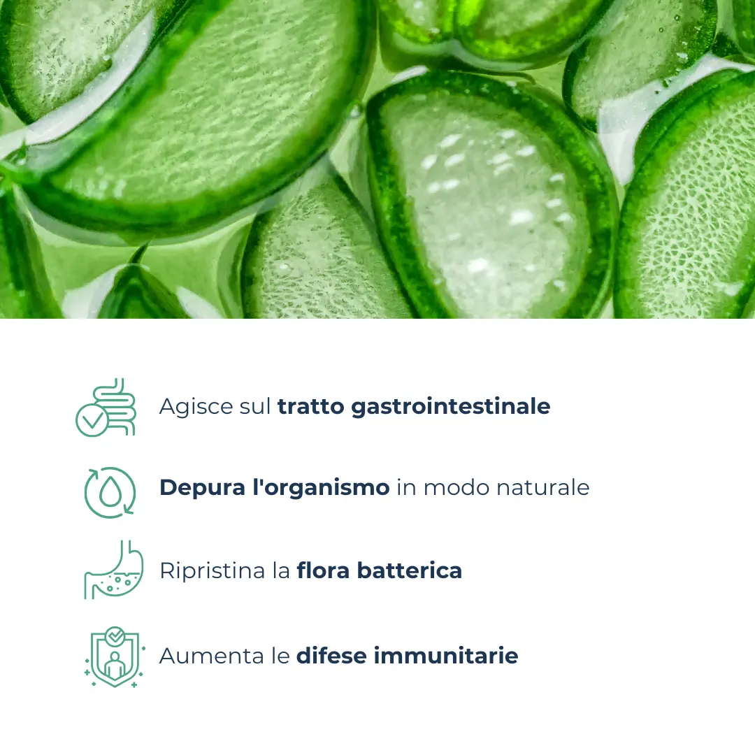 • Funzione depurativa: il succo e polpa di Aloe Vera ha infiniti benefici, sostiene e lenisce in particolare l’apparato digerente, disintossicando il corpo in modo naturale. La sua azione depurativa permette di aiutare il nostro organismo ad eliminare le tossine accumulate nel corso del tempo soprattutto attraverso l’alimentazione. Agendo sull’intestino e stimolando la flora batterica, limita la proliferazione di agenti patogeni, permettendo nel complesso anche un migliore assorbimento dei nutrienti.