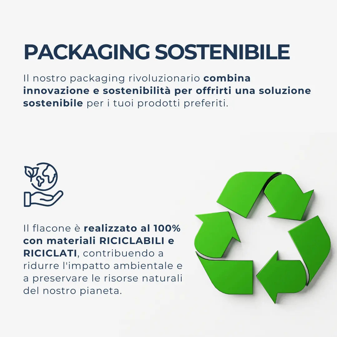 Il nostro packaging rivoluzionario combina innovazione e sostenibilità per offrirti una soluzione sostenibile per i tuoi prodotti preferiti. La bottiglia è realizzato con materiali 100% RICICLABILI e RICICLATI, contribuendo a ridurre l’impatto ambientale e a preservare le risorse naturali del nostro pianeta.